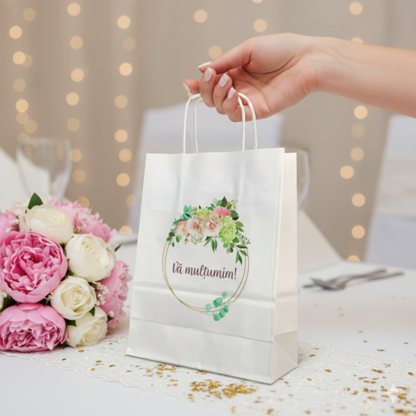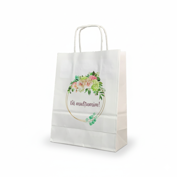 • Sacoşă din hârtie albă 18x24x8 cm cu mâner răsucit