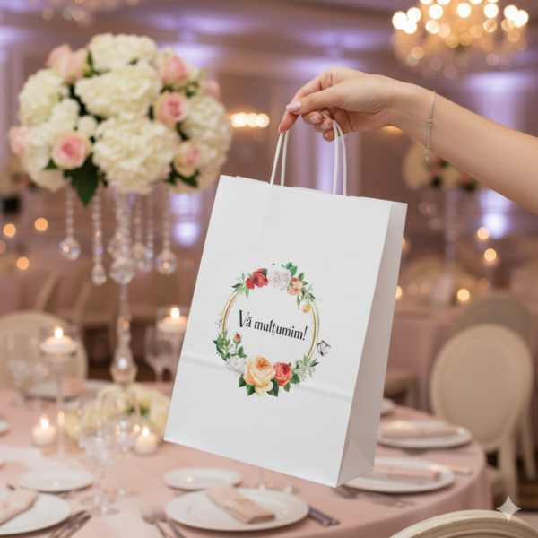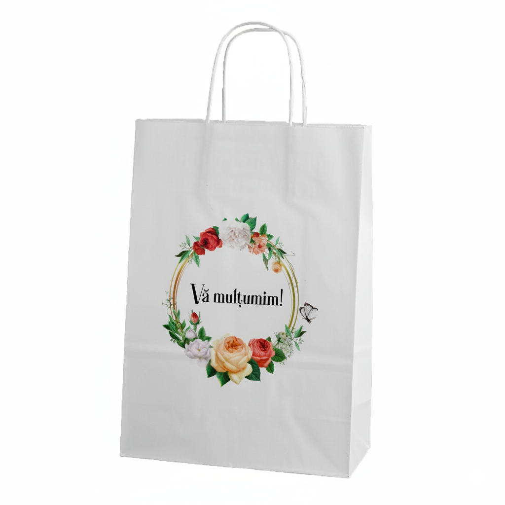 • Sacoşă din hârtie albă 18x24x8 cm cu mâner răsucit